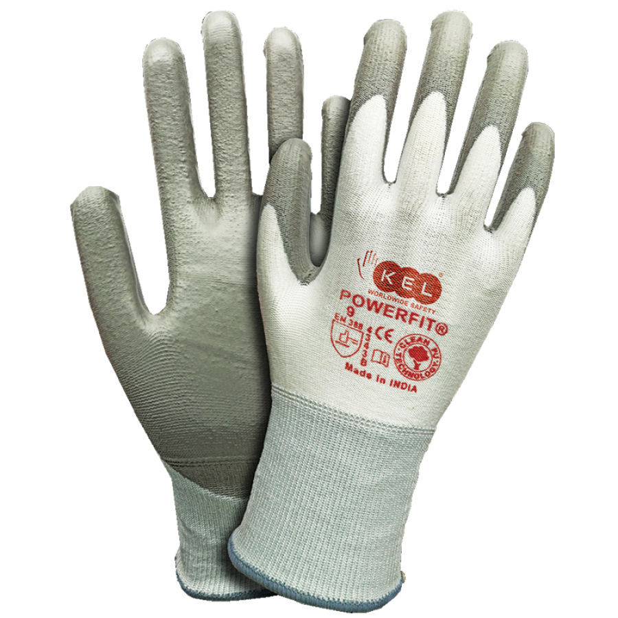 Seamless Knitted 13-Gauge Glove in 100% High-Density Polyethylene Filament with Elastic. Grey CLEAN PU Coating on Palm and Fingertips. Elastic Wrist.